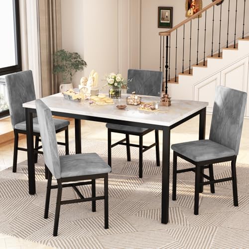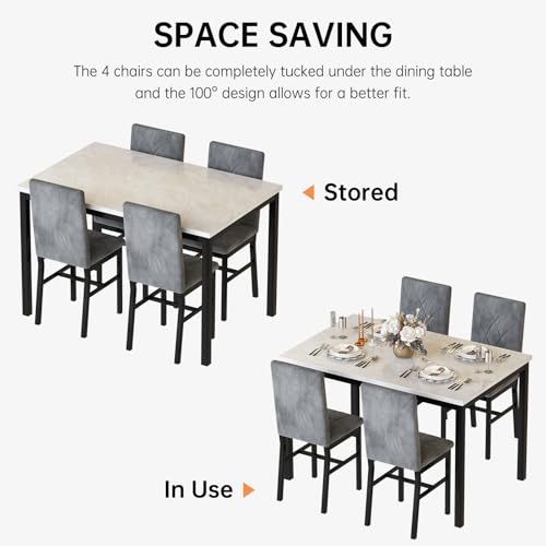 Hooseng Dining Table Set for 4 Faux Marble Kitchen Table and Chairs Set of 4,5 Piece with Velvet Upholstered Dinner Chairs for Compact Dining Room,Small Space,Grey